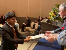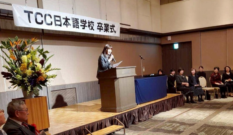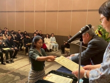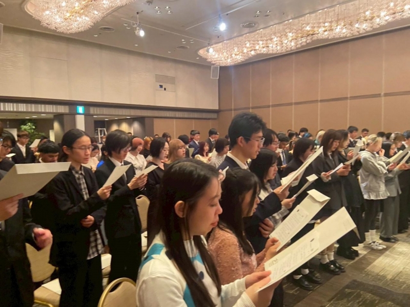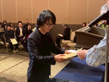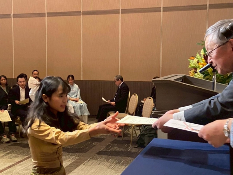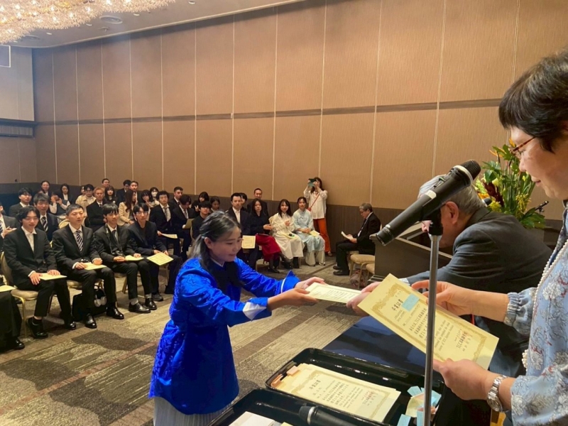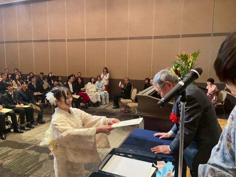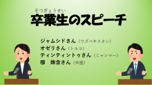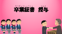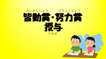 皆勤賞(かいきんしょう)は遅刻(ちこく)や欠席(けっせき)が1日もなかった学生に、努力賞(どりょくしょう)は出席(しゅっせき)と学業(がくぎょう)を一生懸命(いっしょうけんめい)がんばった学生におくられます。
